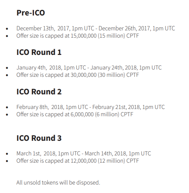 There will be 2 sales, pre-sale and the main crowd sale in 3 rounds. There will be a total of 90 000 000 tokens in circulation and in public sale will be 70% of all CPTF tokens. There will be great bonuses for the one who are joining first. Initial price is rising, so you better join early.